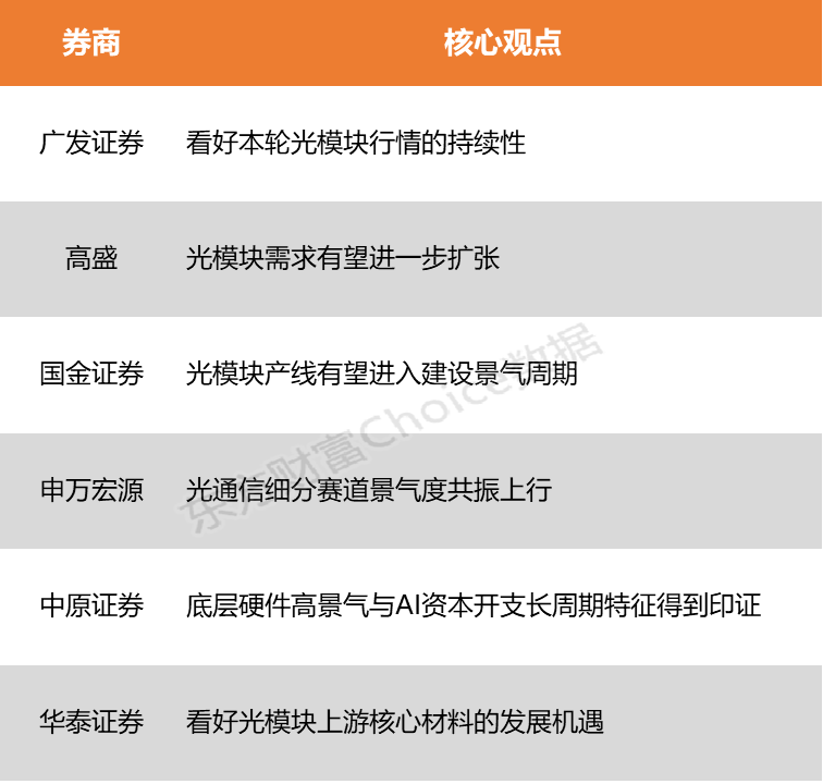 广发证券表示,看好本轮光模块行情的持续性,尤其看好龙头公司的竞争壁垒、物料获取能力和产品长期布局优势,估值有望进一步提升。高盛也在近日发布的研报中对未来光模块需求的增长保持乐观态度。其认为,在AI服务器基础设施周期(横向扩展、纵向升级、全域部署)、光纤替代铜缆趋势、高速连接规格升级,以及从GPU服务器向ASIC服务器多元化发展的推动下,光模块需求有望进一步扩张。
