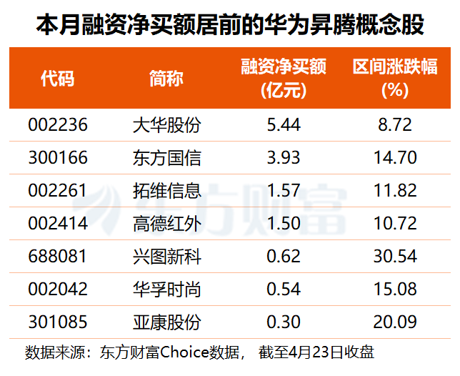 4月以来,超七成昇腾概念股录得股价上涨,开勒股份大涨超55%居首,兴图新科、云天励飞、亚康股份、彩讯股份、东方国信、拓维信息等均有不错表现。