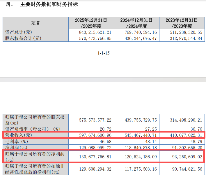 2023年至2025年,锐翔智能的营业收入分别为4.10亿元、5.45亿元、5.98亿元,归母净利润分别为9325.06万元、1.21亿元、1.31亿元。