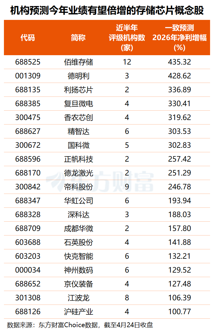 未来增长潜力方面,根据2家及以上机构预测,共有19只存储芯片概念股2026年业绩有望倍增,其中,机构预计佰维存储、德明利今年净利将同比大增超4倍,利扬芯片、复旦微电、香农芯创等5股预测净利增幅均在3倍以上。