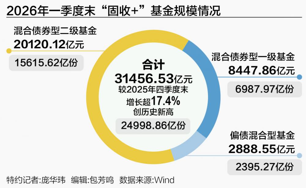 Wind数据显示,截至一季度末,“固收+”基金合计规模达到3.15万亿元,较2025年末增加4663亿元,增长17.4%,创下历史新高。